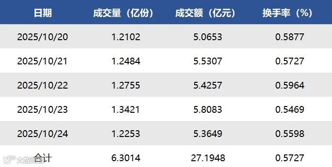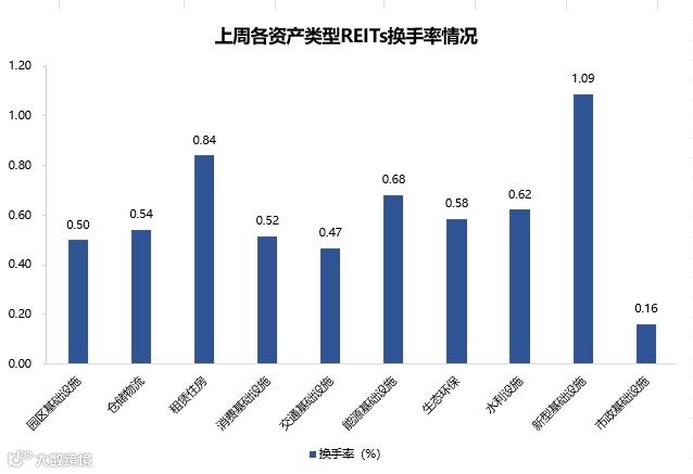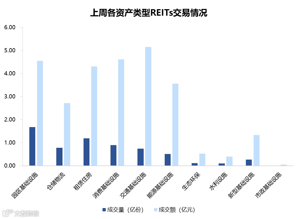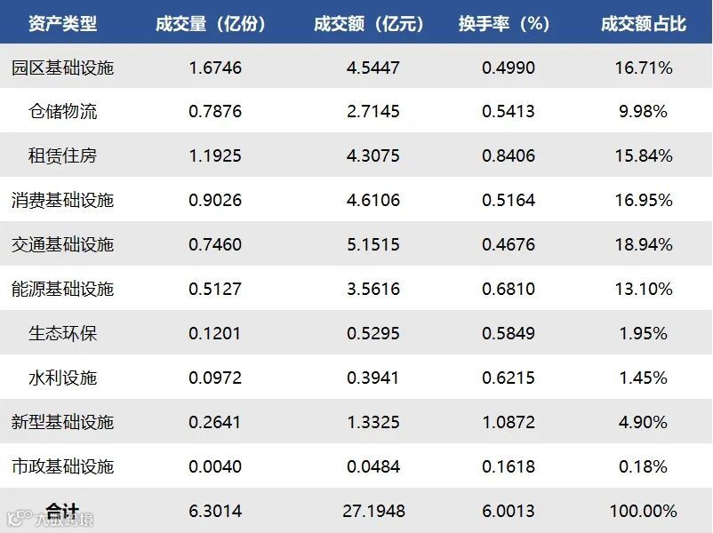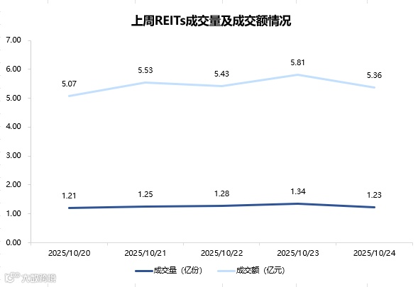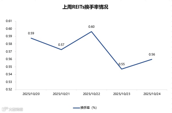 2025年10月20日至2025年10月24日,合计成交量6.3014亿份,成交额27.1948亿元,区间日均换手率0.5727%。各资产类型方面,上周园区基础设施REITs成交量最高,共计1.6746亿份;市政基础设施REIT成交量最低,共计0.0040亿份。另外在成交额占REITs总成交额比重中,交通基础设施REITs(18.94%)排名较高,市政基础设施REITs(0.18%)排名较低。