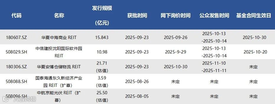 截至10月24日,已获批待上市REITs共有5只(含扩募2只),情况如下表所示: