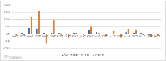 退可守:在2008年、2011年、2018年和2022年沪深300指数分别下跌-65.95%、-25.01%、-25.31%和-21.63%的背景下,混合债券型二级指数涨跌幅为4.52%、-3.93%、-0.32%和-5.07%。