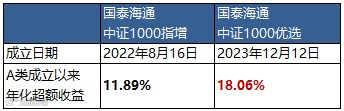 另一只同样布局中证1000指数、但投资范围相对更灵活的国泰海通中证1000优选A(019505),相比中证1000指增有更强的年化超额收益,也是一个值得考虑的选择。