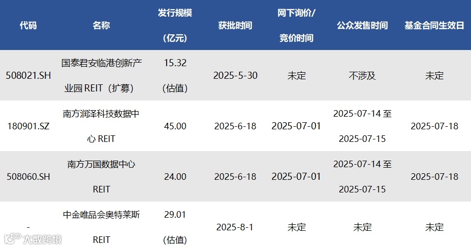 截至8月1日已获批待上市REITs共有4只(含扩募),情况如下表所示: