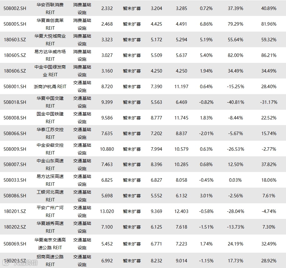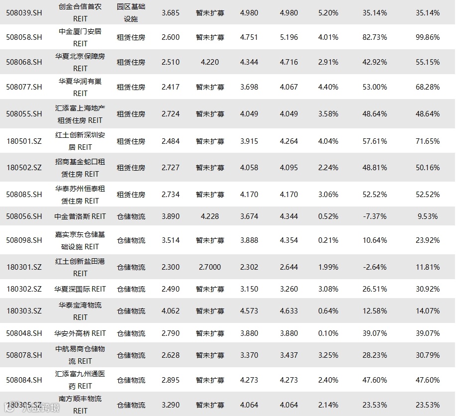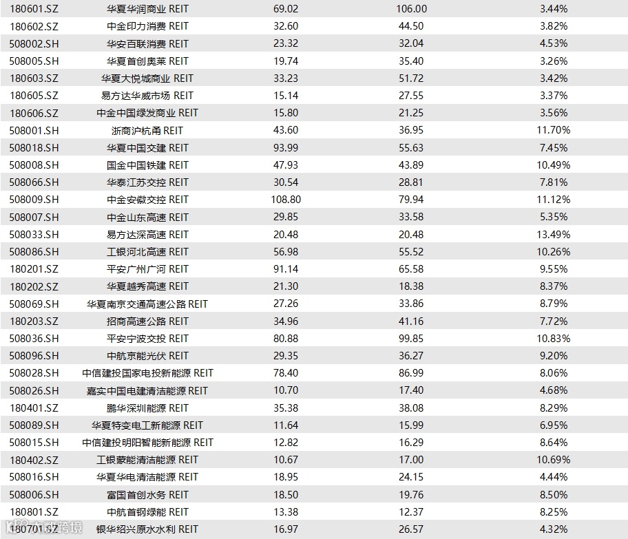 截至8月1日收盘,已上市71只REITs的收益率情况如下表所示: