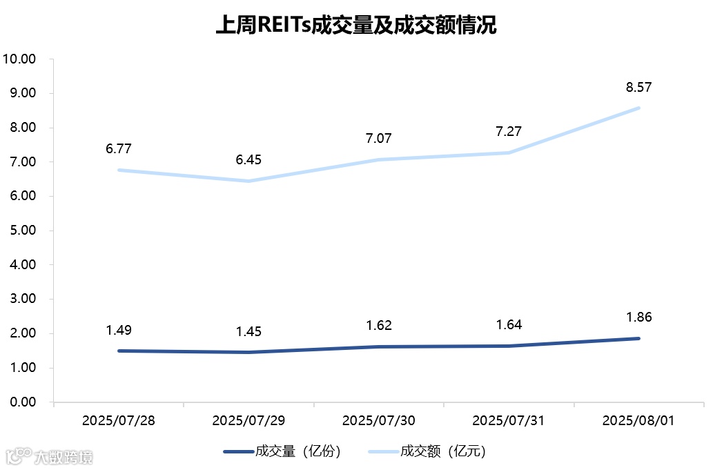 2025年7月28日至2025年8月1日,合计成交量8.0632亿份,成交额36.1361亿元,区间换手率1.0356 %。各资产类型方面,上周园区基础设施REITs成交量最高,共计2.2885亿份;市政基础设施REIT成交量最低,共计0.0144亿份。另外在成交额占REITs总成交额比重中,园区基础设施REITs(21.79%)排名较高,市政基础设施REITs(0.51%)排名较低。
