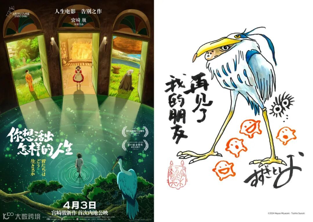 介绍完灵感来源,最后回头简单介绍下这部即将登陆内地大银幕的《你想活出怎样的人生》。2023年,这部电影在日本选择了“零宣发”的方式上映,一度被称为“最神秘的退休作品”;近期则刚刚发布了两张中文海报,其中右侧是制片人铃木敏夫亲笔绘制的“告别版”——“再见了,我的朋友”,或许是吉卜力工作室送给中国观众道别礼物。