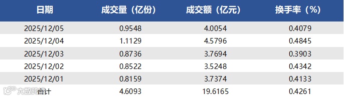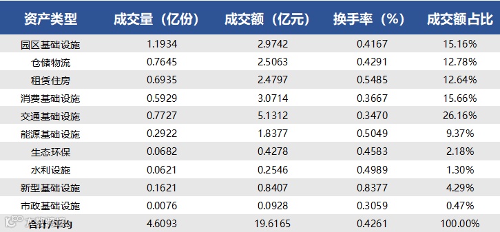 2025年12月1日至2025年12月5日,合计成交量4.6093亿份,成交额19.6165亿元,区间换手率0.4261%。各资产类型方面,上周园区基础设施REITs成交量最高,共计1.1934亿份;市政基础设施REIT成交量最低,共计0.0076亿份。另外在成交额占REITs总成交额比重中,交通基础设施REITs(26.16%)排名较高,市政基础设施REITs(0.47%)排名较低。
