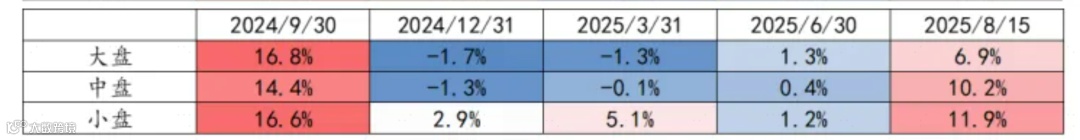 2024年9月以来,A股市场呈现显著的结构性分化,小盘股涨幅持续领先大盘股,成为资金配置的核心方向。具体来看,不同市值分组的累计涨跌幅差异明显: