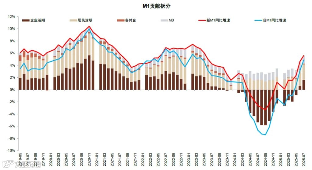 图表:M1增速回升由居民和企业活期存款共同驱动