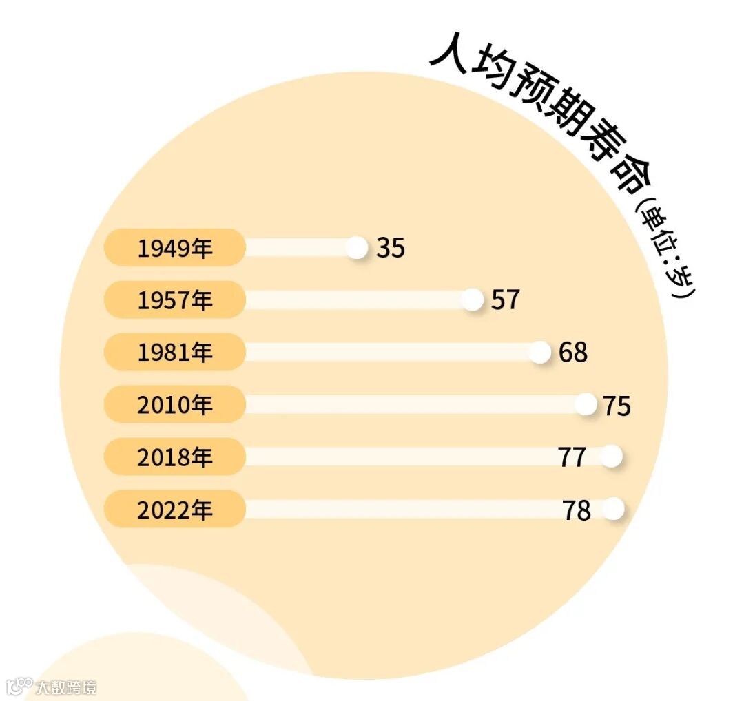 从数据来看,建国初期中国人的平均寿命的只有35岁,70年来中国居民健康指标持续改善,人均预期寿命也与日俱增,目前已增长到78岁左右,与70年前相比增长了一倍多。