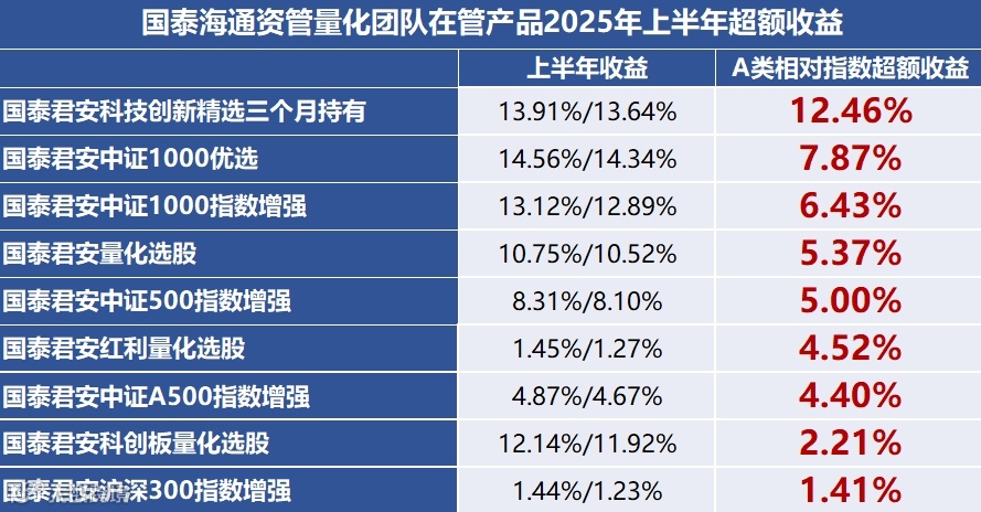注:以上产品均有A/C类份额,此处以A类份额业绩及排名列示。排名数据来源:银河证券,近一年为2024/07/01至2025/06/30;国泰君安量化选股A所属基金分类为2.1.1 偏股型基金(股票上下限60%-95%)(A类),国泰君安科技创新精选三个月持有A所属基金分类为1.1.1 标准股票型基金(A类)