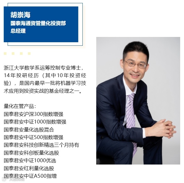 基金经理胡崇海所有在管量化产品业绩列示如下:国泰君安中证1000指数增强A/C类2022.8.16成立,成立以来收益为19.23%/17.87%,同期业绩比较基准-11.72%,同期中证1000指数-12.73%;2022年度收益为-9.49%/-9.63%,同期业绩比较基准为-13.06%;2023年度收益为2.56%/2.17%,同期业绩比较基准为-5.91%; 2024年收益为13.54%/13.08%,同期业绩比较基准1.41%。国泰君安沪深300指数增强A/C类2023.4.19成立,成立以来收益为6.93%/5.99%,同期业绩比较基准-4.97%,同期沪深300指数-5.43%;2023年度收益为-11.60%/-11.85%,同期业绩比较基准为-16.73%; 2024年收益为19.24%/18.77%,同期业绩比较基准14.04%。国泰君安中证500指数增强A/C类2021.12.15成立,成立以来收益为5.75%/4.26%,同期业绩比较基准-17.99%,同期中证500指数-19.23%;2021年度收益为1.49%/1.47%,同期业绩比较基准0.46%;2022年度收益为-11.34%/-11.70%,同期业绩比较基准-19.30%;2023年度收益为-2.60%/-2.98%,同期业绩比较基准-7.01%; 2024年收益为11.41%/10.95%,同期业绩比较基准5.40%。国泰君安量化选股A/C类2022.8.18成立,成立以来收益为22.44%/21.05%,同期业绩比较基准-3.02%,同期偏股基金指数-14.47%;2022年度收益-4.95%/-5.09%,同期业绩比较基准收益-8.15%;2023年度收益8.33%/7.91%,同期业绩比较基准收益-5.16%; 2024年收益为7.37%/6.94%,同期业绩比较基准7.49%。国泰君安科技创新精选三个月持有A/C类2022.11.16成立,成立以来收益为16.31%/14.82%,同期业绩比较基准-0.99%,同期科创50指数-4.62%;2022年度收益为-3.81%/-3.87%,同期业绩比较基准为-5.90%;2023年度收益为1.40%/0.92%,同期业绩比较基准为-6.10%; 2024年收益为4.69%/4.15%,同期业绩比较基准6.60%。国泰君安中证1000优选A/C类2023.12.12成立,成立以来收益为31.03%/30.23%,同期业绩比较基准4.77%,同期中证1000指数4.63%;2024年收益为14.68%/14.22%,同期业绩比较基准1.41%。国泰君安科创板量化选股2024.4.16成立,成立以来收益为31.63%/30.99%,同期业绩比较基准30.46%。国泰君安红利量化选股2024.10.30成立,成立以来收益为4.15%3.88%,同期业绩比较基准0.90%。国泰君安中证A500指增2024.12.17成立,成立以来收益4.17%/3.95%,同期业绩比较基准0.32%。国泰君安上证科创板综合价格指数增强2025.4.17成立,成立未满六个月,业绩不予展示。