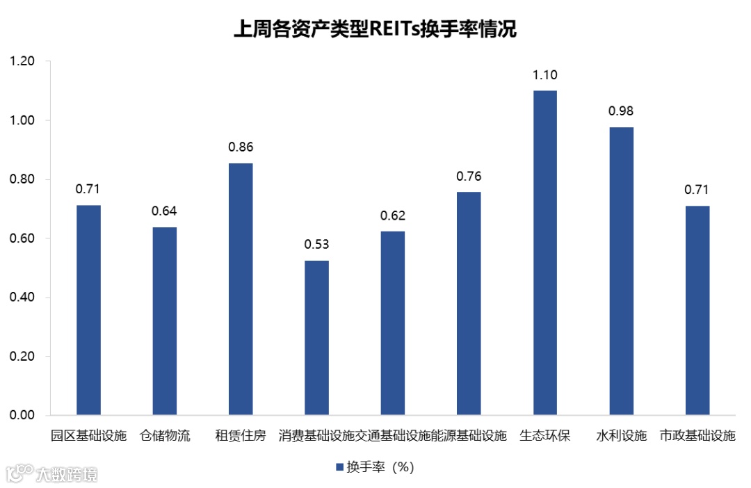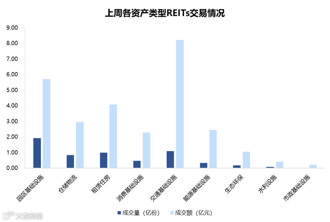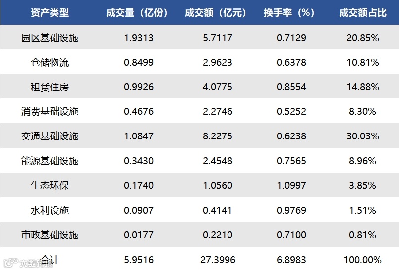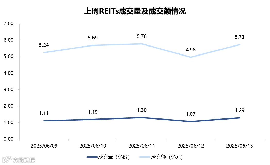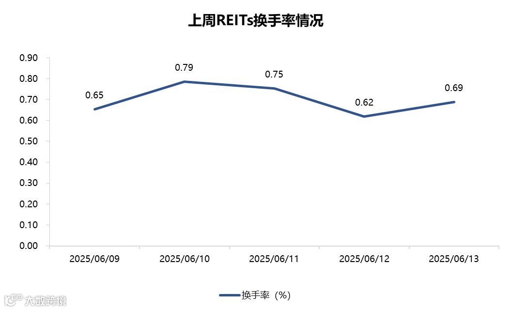 2025年6月9日至2025年6月13日,合计成交量5.9516亿份,成交额27.3996亿元,区间换手率0.7000%。各资产类型方面,上周园区基础设施REITs成交量最高,共计1.9313亿份;市政基础设施REIT成交量最低,共计0.0177亿份。另外在成交额占REITs总成交额比重中,交通基础设施REIT(30.03%)排名较高,市政基础设施REITs(0.62%)排名较低。