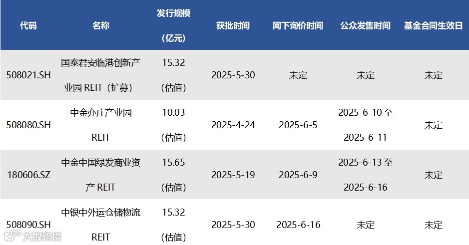 截至6月13日已获批待上市REITs共有4只(含扩募1只),情况如下表所示: