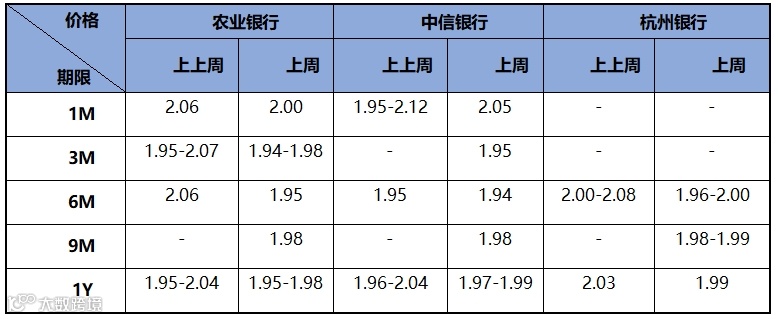 存款价格方面,因资金价格趋于宽松,存款价格较上上周有所下降。近两周存款市场情况如下表所示:
