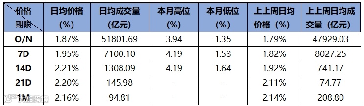 上周隔夜日均成交5.2万亿,较上上周增加0.4万亿,日均价格从1.79%上升到1.87%;7D日均成交量从0.8万亿下降至0.71万亿,价格从1.82%上升至1.95%;14D成交量从上上周的741亿下降至1308亿,价格从1.92%上升至2.21%。