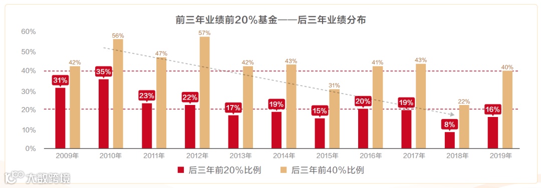 基金投资亦是如此。假设我们很幸运选到了过去三年排名靠前的基金,这样的优秀投资业绩是否能够继续延续呢?统计结果显示,前三年业绩排名前20%的基金在后三年仍能排在前20%的比例非常低,比如2016-2018年三年区间业绩前20%的基金仅有8%的比例在2019-2021年的三年区间业绩仍排在前20%。这说明了基金业绩同样遵循了均值回归的原理,短期业绩排名靠前的基金往往是因为押准了当年的热点或风口,在下一轮周期中再次脱颖而出的概率较低,单纯线性外推基金业绩的选基方式并不可持续。