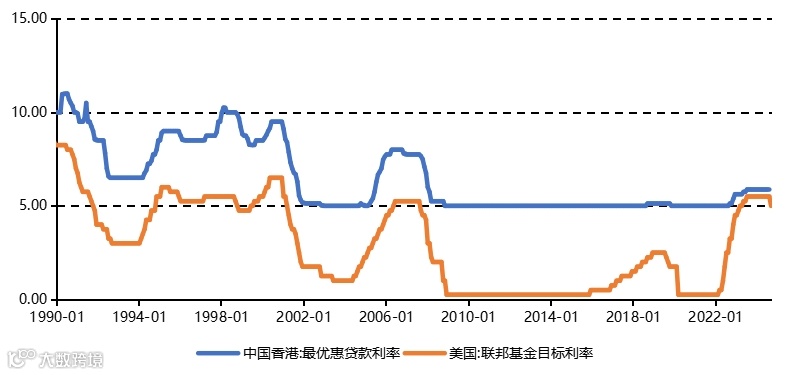 图表:香港最优贷款利率与美国联邦基金目标利率保持同步