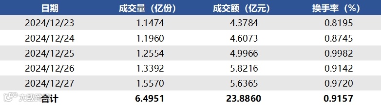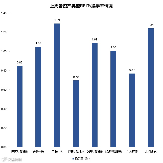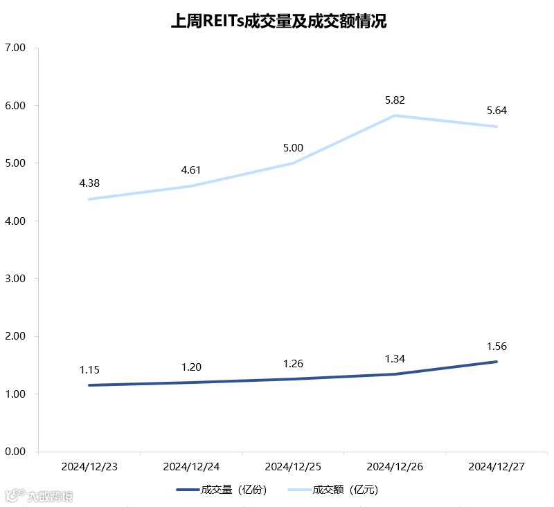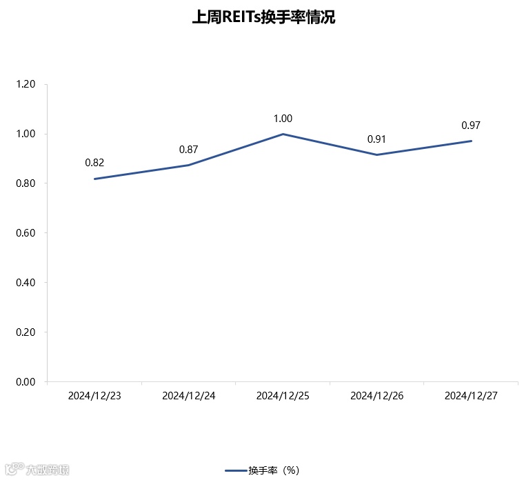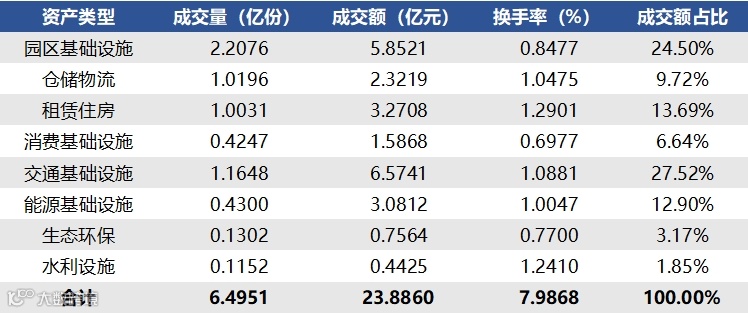 2024年12月23日至2024年12月27日,合计成交量6.4951亿份,成交额23.8860亿元,区间换手率0.9157。各资产类型方面,上周园区基础设施REITs成交量最高,共计2.2076亿份;水利设施REITs成交量最低,共计0.1152亿份。另外在成交额占REITs总成交额比重中,交通基础设施REITs(27.52%)排名较高,水利基础设施REITs(1.85%)排名较低。