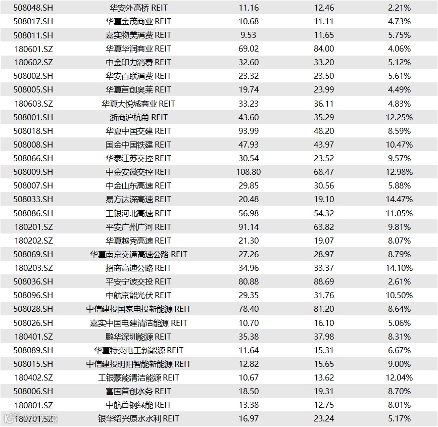 截至12月27日收盘,已上市57只REITs的收益率情况如下表所示: