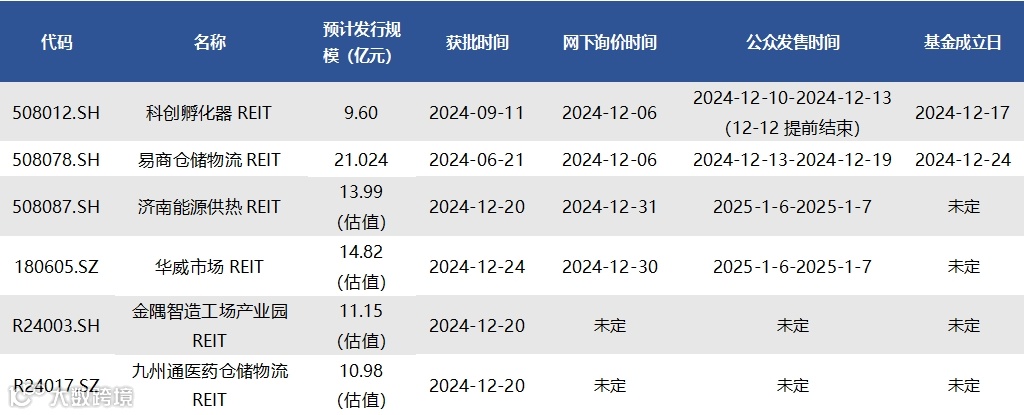 截至12月27日,已获批待上市REITs共有6只,情况如下表所示: