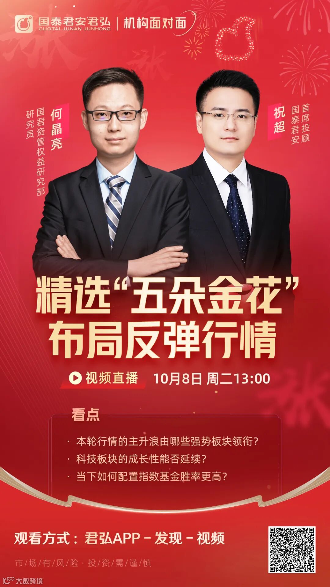 国泰君安资管权益研究部研究员 何晶亮、国泰君安首席投顾 祝超将为大家分享反弹行情下的投资机遇。10月8日(今日)下午13:00,请大家锁定国泰君安君弘APP、国泰君安资管蚂蚁财富号、天天基金财富号、京东金融、新浪财经等平台,我们不见不散!