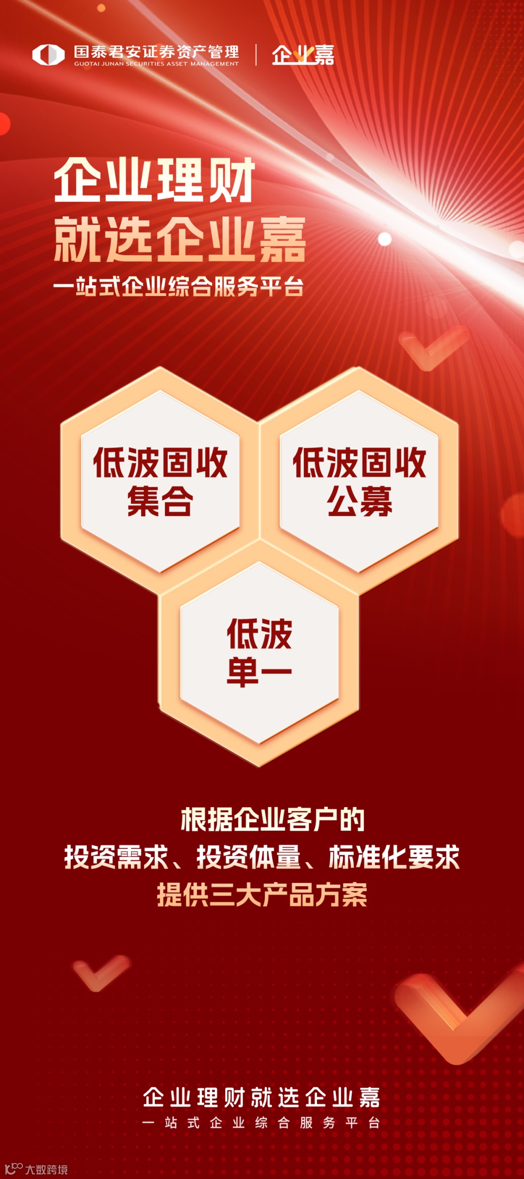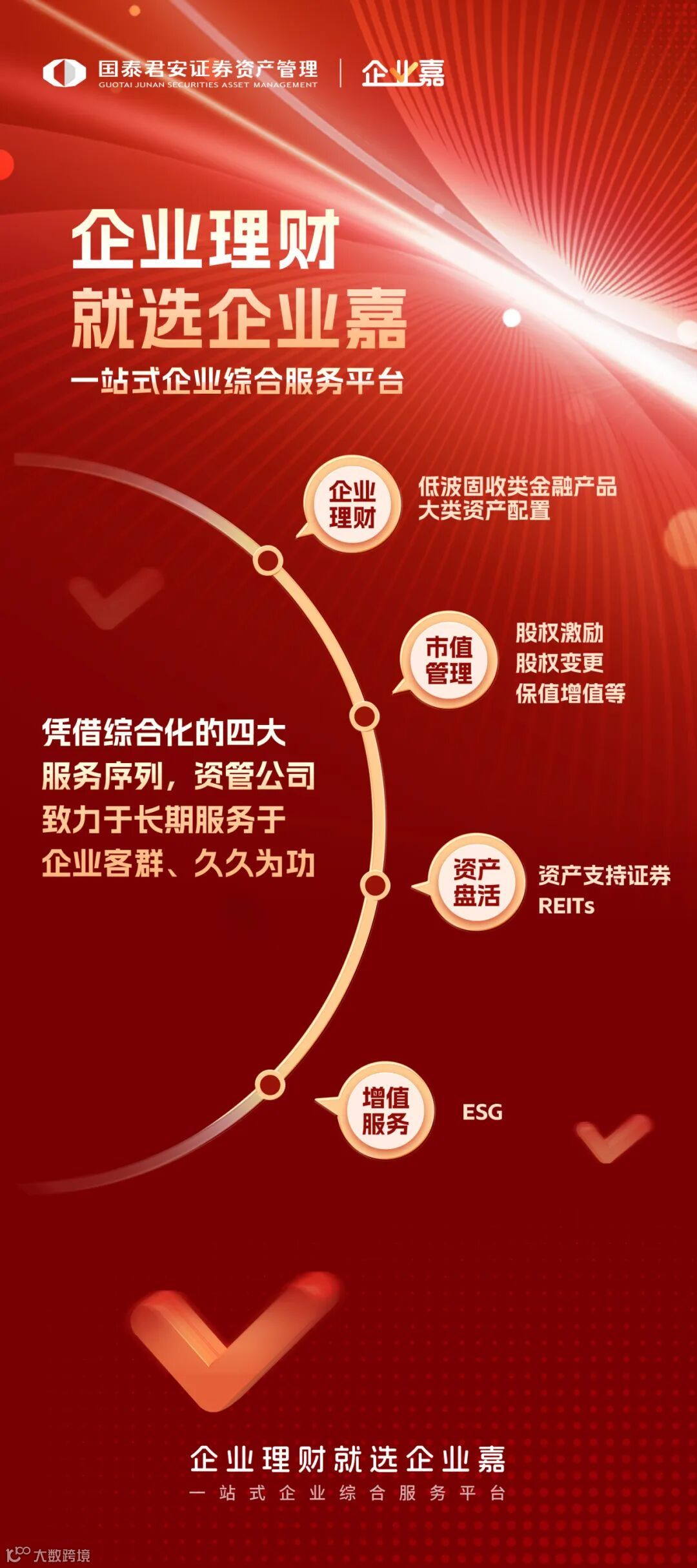 今年以来,随着银行存款政策发生调整,企业的低风险理财需求出现外溢。国泰君安各条线紧密协作,积极开展企业客户综合服务。国泰君安资产管理公司以企业需求为锚,快速响应并打造了一站式的企业服务平台“企业嘉”——涵盖企业理财、市值管理、资产盘活、增值服务四大服务体系,贯穿企业的全生命周期。