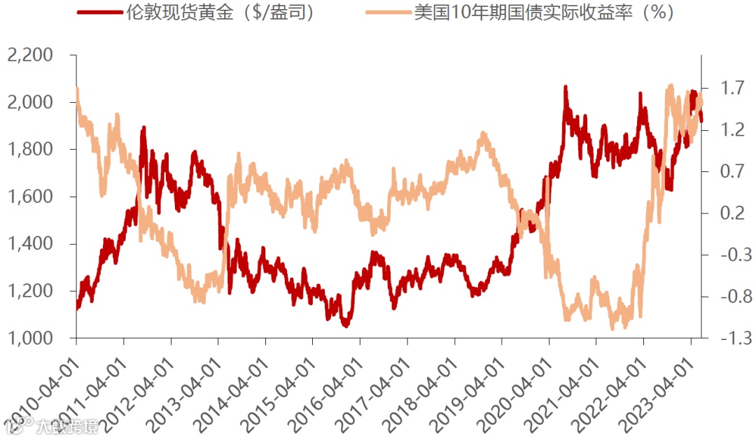 黄金方面,金价与美国10年期国债实际收益率呈现显著的负相关性。美联储主席鲍威尔在6月表态称“仍然看到存在一种在不造成大规模失业的情况下实现通胀缓解的路径”,即美国经济存在软着陆的可能。实际上,即使美联储在年内再加息两次,考虑到目前美国就业市场依然强劲,且联储可能在2024年开始降息,美国经济确实有在通胀得到有效控制的同时实现软着陆,从而避免走向全面衰退的可能,即美国实际利率将不会大幅下降,因此对金价表现持谨慎观点。
