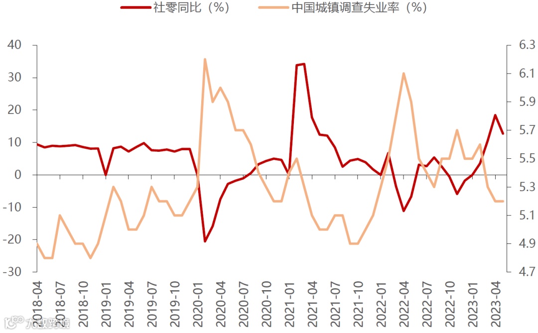 消费方面,社零增速与城镇调查失业率呈现明显的负相关关系,消费的修复情况还是取决于就业情况。2023年以来,在国内制造业受制于美国去库周期而景气整体走弱的背景下,服务业在推动国内失业率回落方面起到了关键作用,但5月服务业有明显的景气走弱迹象,这可能一方面是由于制造业景气下行的传导,另一方面是前期积压的服务消费需求集中释放后,新增服务消费需求表现不强:2023年5月,服务业PMI新订单为49.5%,环比下降6.9个点,结束此前连续四个月位于荣枯线以上;餐饮收入同比+35.1%,剔除基数影响,四年平均同比为2.28%;CPI服务环比下降0.1%,为CPI服务有披露以来同期环比降幅最大值,都指向服务业在5月有所走弱。服务业的景气走弱会对其吸纳就业产生负面影响,同样吸纳了大量就业的中小制造业企业自4月以来景气也持续走弱,因此从就业角度看,预计三季度消费会有所承压。结构方面,二季度必需消费品和地产后周期消费品都偏弱,5月服务消费和出行消费也有所走弱,后续有待关注如6月下旬出台的新能源车购置税减免政策延期等消费支持政策对消费的托底效果。