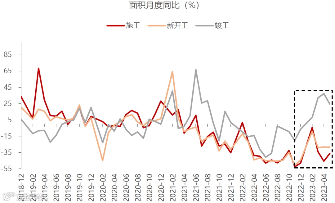 2)地产投资:可拆分为土地购置费和建安投资两部分。土地购置费月度同比与滞后9个月的土地成交价款月度同比有较好的拟合关系,2023年5月土地购置费同比-7.02%,连续第三个月同比下降且降幅仍在扩大,因此后续土地购置费月度同比降幅可能进一步扩大。建安投资方面,政策层面(3,500亿元保交楼专项借款+2,000亿元保交楼贷款支持计划)持续推进保交楼的背景下,竣工表现显著好于新开工和施工:2023年5月,国内房屋竣工面积累计同比+19.6%,而施工和新开工分别为-6.2%和-22.6%。但需要关注到的是,保交楼在实际操作中仍存在诸多问题:一些楼盘因资产贬值而无法提供充足抵押物、金融机构参与保交楼积极性有限令保交楼资金不足、房企因流动性风险未完全化解导致问题项目仍有新增,也就是说,地产销售仍在走弱会拖累保交楼专项资金的“撬动效应”。