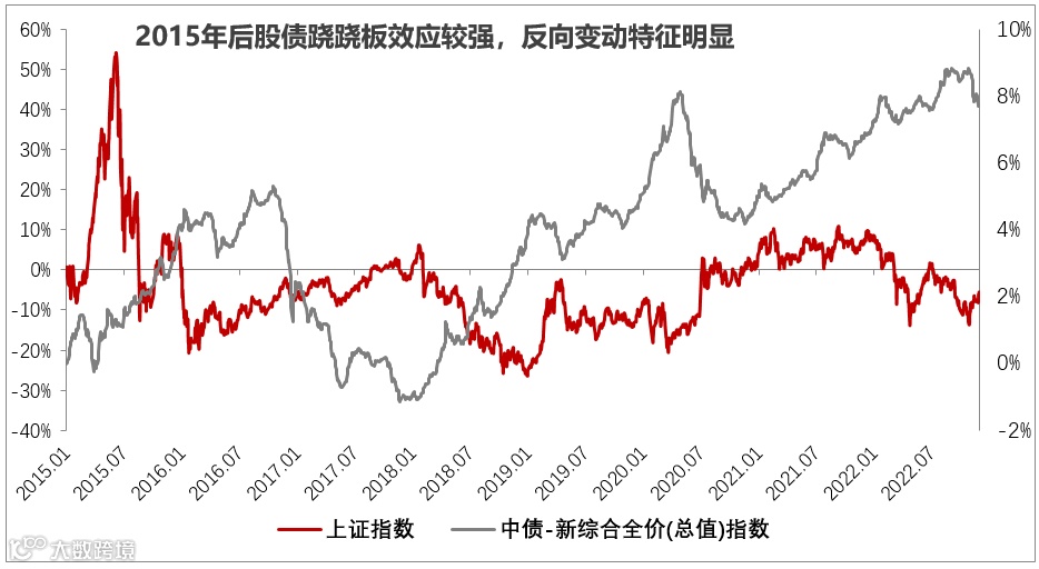 注:数据来自Wind,统计区间2015.1.4-2022.12.2;上证指数涨跌幅为左轴,中债-新综合全价(总值)指数涨跌幅为右轴。