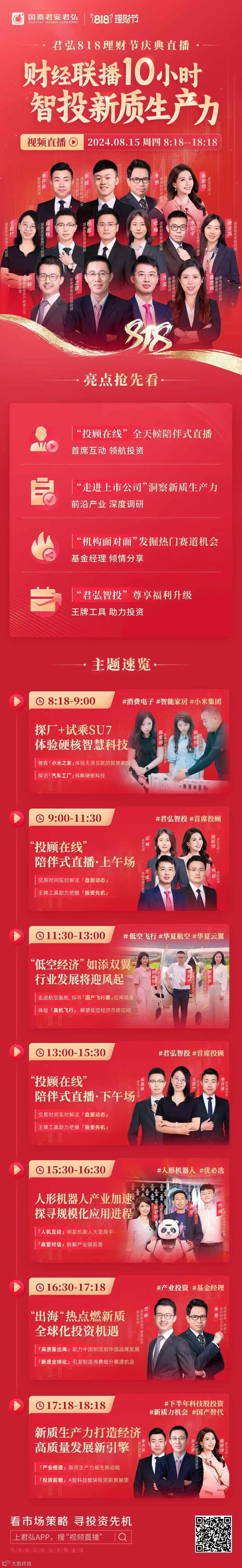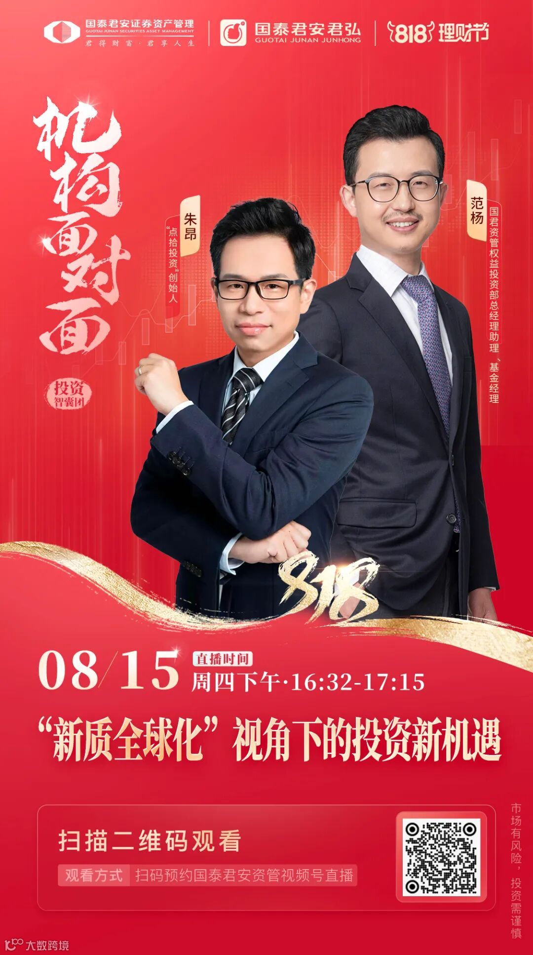 国泰君安818理财节庆典直播将于8月15日(星期四)正式启幕,国君资管权益投资部总经理助理 范杨、“点拾投资”创始人 朱昂 将为大家分享“新质全球化”背景下的投资新机遇。8月15日下午16:32,请大家锁定国泰君安资管视频号、国泰君安资管蚂蚁财富号、天天基金财富号、京东金融、新浪财经等平台,我们不见不散!