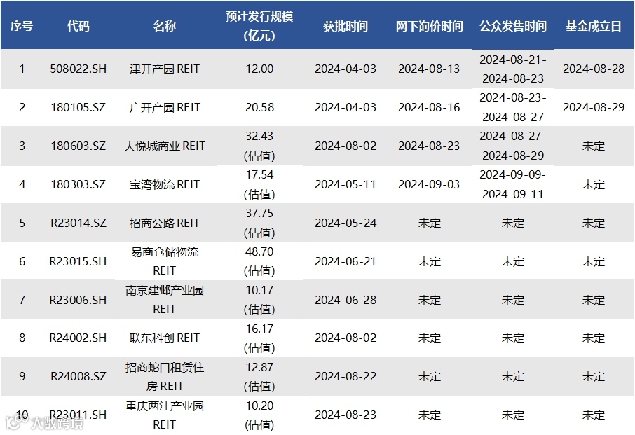 截至8月30日,已获批待上市REITs共有10只,情况如下表所示: