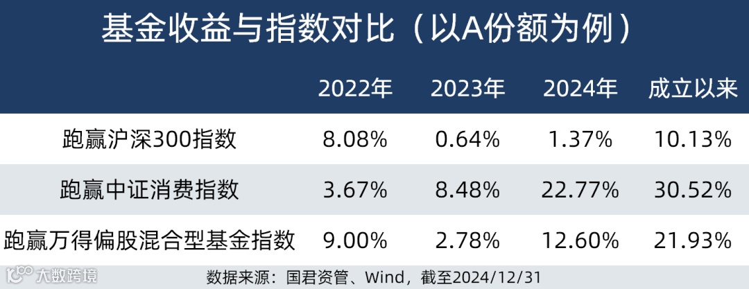注1:数据来源:国君资管、wind,截至20241231,基金业绩经托管复核;排名数据来源为银河证券,A类排名标准为偏股型基金(股票上下限60%-95%)(A类),C类排名标准为偏股型基金(股票上下限60%-95%)(非A类)。2024年统计区间20240101-20241231,A类排名203/1719,C类排名145/1277;2023年统计区间20230101-20231231,A类排名504/1523,C类排名333/1016;过去两年统计区间20230101-20241231, A类排名213/1491,C类排名137/994。基金的过往业绩不预示其未来表现,取得超额收益不代表基金一定取得正收益。产品成立于2022年7月19日,国泰君安品质生活混合2022年业绩为-1.73%/-1.90%,同期业绩比较基准-6.68%;2023年业绩为-10.74%/-11.10%,同期业绩比较基准-8.61%;2024年业绩为16.05%/15.59%, 同期业绩比较基准13.99%;成立以来业绩为1.80%/0.81%,同期业绩比较基准-2.80%。基金经理范杨在管的其他偏股混合型产品——国泰君安消费机遇A类/C类成立以来(20230919-20241231)表现0.95%/0.43%,同期业绩比较基准-6.98%;2023年业绩为-6.17%/-6.27%,同期业绩比较基准-7.10%;2024年业绩为7.59%/7.15%,同期业绩比较基准0.12%。国泰君安价值精选A类/C类成立以来(20220809-20241231)表现-9.71%/-10.57%,同期业绩比较基准-1.73%;2022年业绩为0.46%/0.30%,同期业绩比较基准-4.66%;2023年业绩为-13.83%/-14.17%,同期业绩比较基准-9.02%;2024年业绩为4.30%/3.88%,同期业绩比较基准13.32%。国泰君安君得鑫A类/C类成立以来(20220321-20241231)表现-14.71%/-13.21%,同期业绩比较基准0.71%;2022年业绩为-4.69%/-4.20%,同期业绩比较基准-4.94%;2023年业绩为-13.78%/-13.24%,同期业绩比较基准-6.97%;2024年业绩为3.80%/4.42%,同期业绩比较基准13.88%。国泰君安君得诚成立以来(20220214-20241231)表现-35.12%,同期业绩比较基准-5.55%;2022年业绩为-13.55%,同期业绩比较基准-5.22%;2023年业绩为-18.38%,同期业绩比较基准-6.80%;2024年业绩为-3.04%,同期业绩比较基准13.48%。基金超越指数收益的计算方式为:同时段基金收益-指数收益。沪深300指数2022年(2022.07.19-2022.12.31)收益-9.81%,2023年全年收益-11.38%,2024年全年收益14.68%,自基金成立以来至今(2022.07.19-2024.12.31)收益-8.33%;中证消费指数2022年(2022.07.19-2022.12.31)收益-5.40%,2023年全年收益-19.22%,2024年全年收益-6.72%,自基金成立以来至今(2022.07.19-2024.12.31)收益-28.72%;偏股混合型基金指数2022年(2022.07.19-2022.12.31)收益-10.73%,2023年全年收益-13.52%,2024年全年收益3.45%,自基金成立以来至今(2022.07.19-2024.12.31)收益-20.13%。因产品业绩比较基准以沪深300为主,故选择沪深300指数对标。因产品主要配置消费赛道,故选择中证消费指数对标。因产品属于偏股混合型基金,故选择偏股混合型基金指数对标。