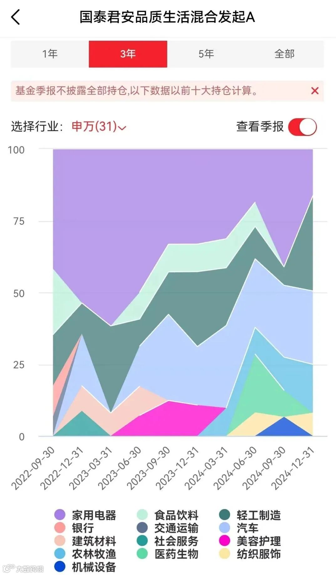 看他管理的基金国泰君安品质生活(A/C:016130/016131),确实低配了大多数消费基金爱买的的食品饮料,反而眼光独到地投资轻工制造、汽车、农林牧渔、家用电器、纺织服饰这些行业。