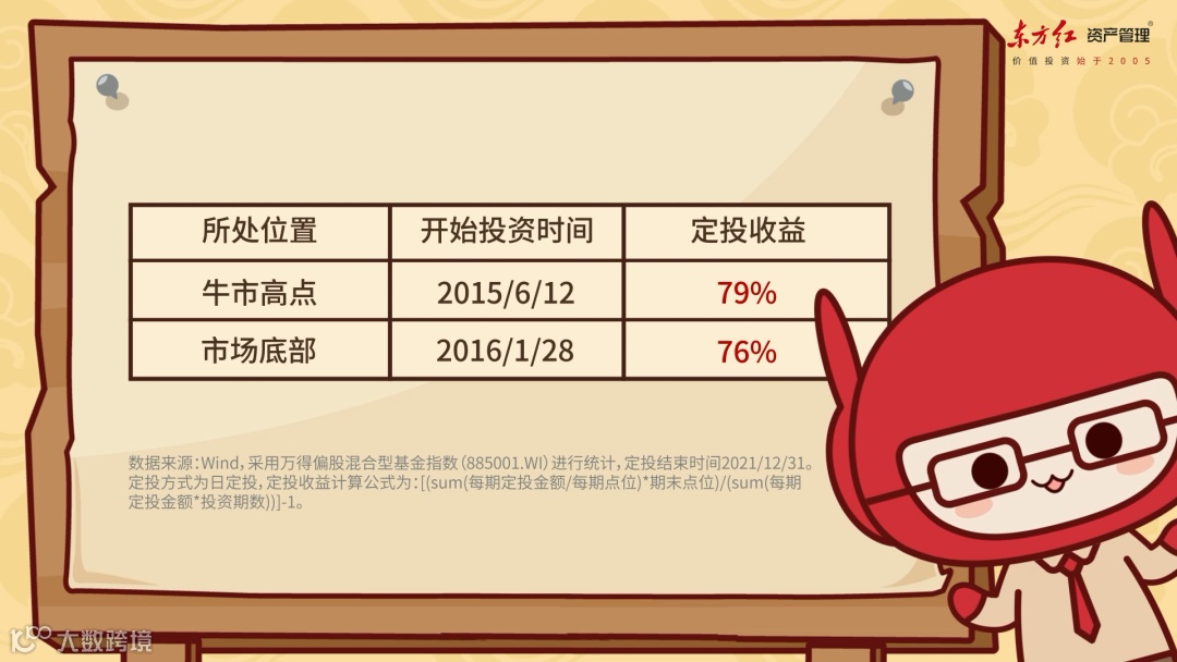以万得偏股混合型基金指数作为标的,截至2021年底:在牛市高点(2015/6/12)开始的定投,累计收益为79%;而在市场底部(2016/1/28)开始的定投,累计收益为76%,可见两者的收益没有非常大的差别。