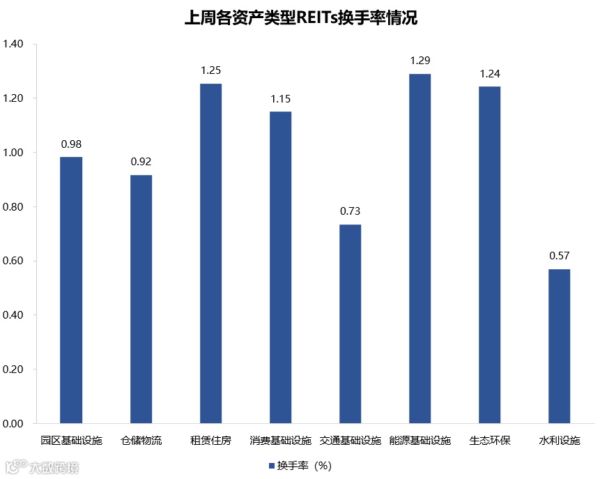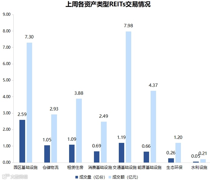 2025年1月13日至2025年1月17日,合计成交量7.5904亿份,成交额30.3652亿元,区间换手率1.0079 %。各资产类型方面,上周园区基础设施REITs成交量最高,共计2.5916亿份;水利设施REITs成交量最低,共计0.0529亿份。另外在成交额占REITs总成交额比重中,交通基础设施REITs(26.29%)排名较高,水利设施REITs(0.71%)排名较低。