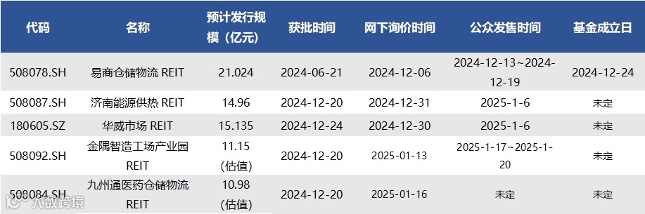截至1月17日,已获批待上市REITs共有5只,情况如下表所示: