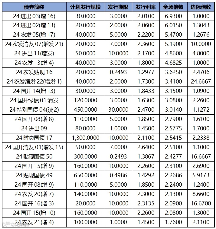 利率债发行方面,上周发行投标热度较上上周有所下降,热门券种3年期24进出03(增16),全场倍数6.9300,边际倍数1.0000;2年期24进出02(增13),全场倍数6.0150,边际倍数1.3043。上周利率债发行价格和机构投标情绪如下表所示: