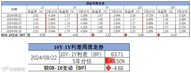 截至8月22日,国债收益率短端下行,长端下行,曲线走平,10Y-1Y利差为63.71,较8月16日下行4.68BP,处于近5年45.50%的历史分位。