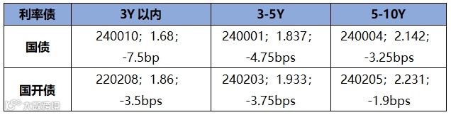 上周短期限1年期国开债收益率上行约1.16bp,3年期国开债收益率下行约0.50bp,5年期国开债收益率下行约1.46bp,长期限10年期国开债收益率下行约1.77bp。