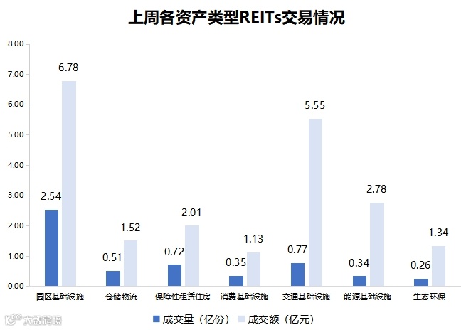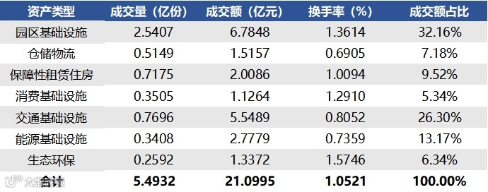 2024年5月6日至2024年5月10日,合计成交量5.4932亿份,成交额21.0995 亿元,区间换手率1.0521%。各资产类型方面,本周园区基础设施REITs成交量最高,共计2.5407亿份;生态环保REITs成交量最低,共计0.2592亿份。另外在成交额占REITs总成交额比重中,园区基础设施REITs(32.16%)排名较高,消费基础设施REITs(5.34%)排名较低。