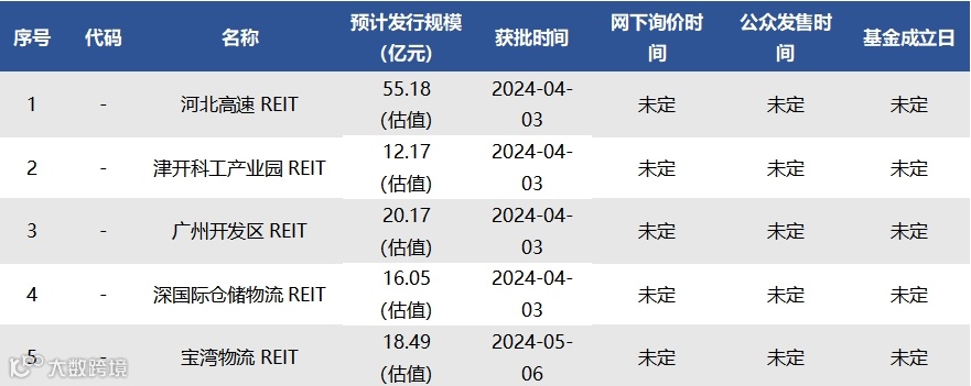 截至5月10日,已获批待上市REITs共有5只,情况如下表所示: