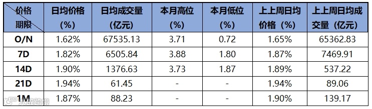 上周资金面整体较为紧张,大行、股份制整体融出克制,加权价格不高,周五隔夜加权1.60%,7天加权1.80%,押信用隔夜价格在1.85%-1.90%,7d押信用1.85%-1.90%。
