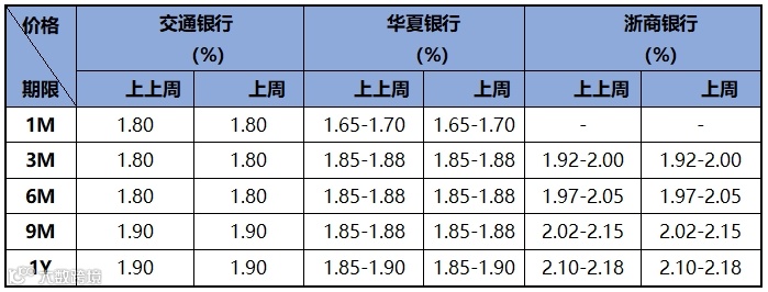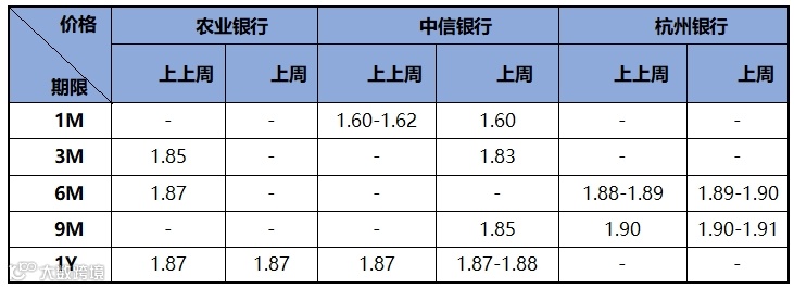 上周资金面整体较为紧张,大行、股份制整体融出克制,加权价格不高,周五隔夜加权1.60%,7天加权1.80%,押信用隔夜价格在1.85%-1.90%,7d押信用1.85%-1.90%。存款价格方面,上周存款利率较上上周无明显变化。近两周存款市场情况如下表所示:
