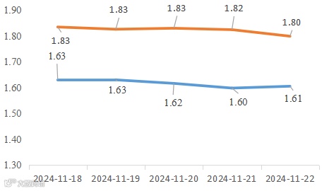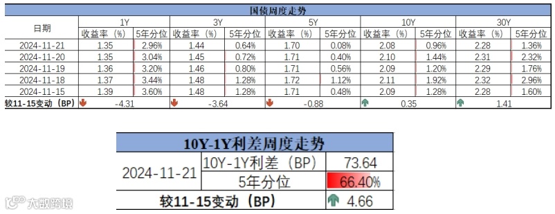 截至11月22日,国债收益率短端下行,长端上行,曲线走陡,10Y-1Y利差为73.64,较11月15日上行4.66BP,处于近5年66.40%的历史分位。