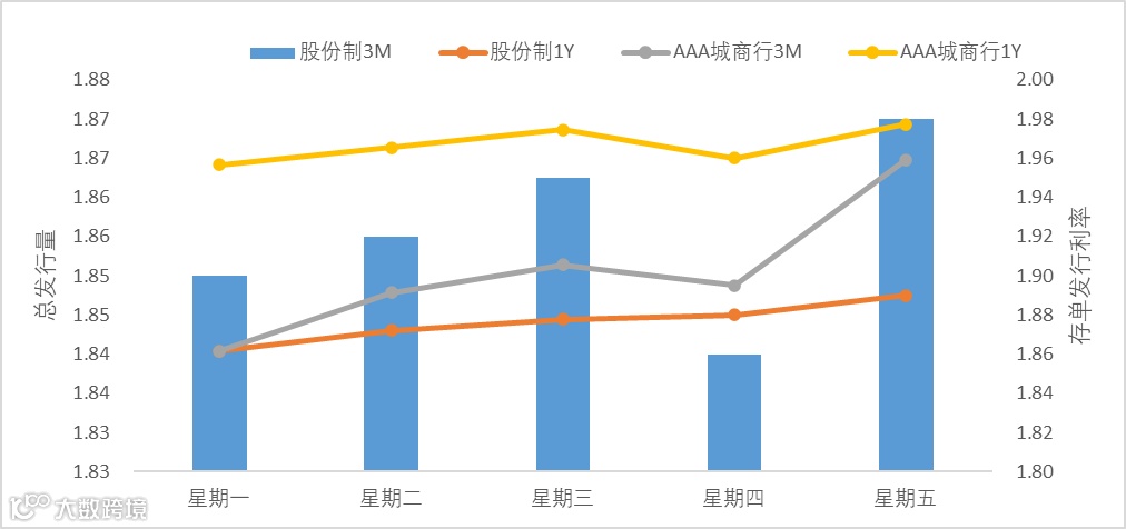 上周资金面整体较为紧张,大行、股份制整体融出克制,加权价格不高,周五隔夜加权1.60%,7天加权1.80%,押信用隔夜价格在1.85%-1.90%,7d押信用1.85%-1.90%。存单一级平均价格较上上周上行不到1bp,其中股份制存单利率上行超过1bp,城商行一级存单利率较上上周上行不到1bp。从期限来看,1M存单利率较上上周上行4bp左右,1Y存单利率较上上周上行超过4bp。从主体来看,中信银行1Y存单利率较上上周上行0.5bp。