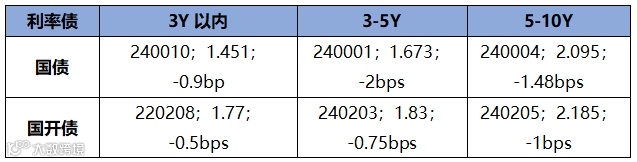 上周短期限1年期国开债收益率上行约1.33bp,3年期国开债收益率下行约0.12bp,5年期国开债收益率下行约1.25bp,长期限10年期国开债收益率下行约1.05bp。