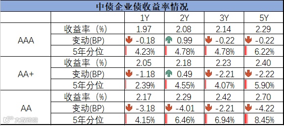 信用债方面,各期限中短期票据和企业债到期收益率整体下行,中债中短期票据到期收益率1年期下行0.16bp,3年期下行1.08bp;企业债到期收益率1年期下行0.17bp,3年期下行1.58bp。