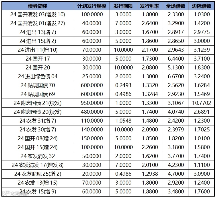 利率债发行方面,上周发行投标热度较上上周有所下降,热门券种3年期24国开清发03(增发10),全场倍数2.3300,边际倍数1.0300;7年期24国开清发01(增发27)全场倍数3.2900,边际倍数1.4200。上周利率债发行价格和机构投标情绪如下表所示: