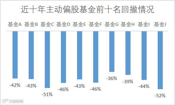 根据Wind数据,在2011年底至2021年底这十年间,累计收益率排名前十名的主动偏股基金(普通股票基金和偏股混合基金),其平均回撤高达44%,其中两只最大回撤超过50%,而最小的回撤也有36%。