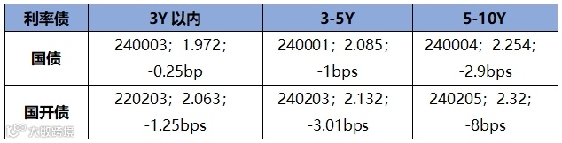 上周短期限1年期国开债收益率上行约4.2bp,3年期国开债收益率下行约1.4bp,5年期国开债收益率下行约2.7bp,长期限10年期国开债收益率下行约7.9bp。